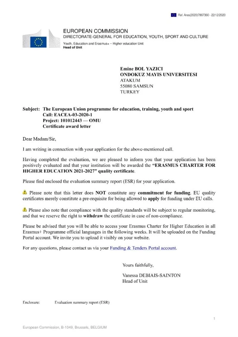 OMÜ proje başlangıcından günümüze başarılı bir şekilde yürüttüğü Avrupa Birliği (AB) destekli Erasmus Değişim Programı deneyimi ile bir kez daha Avrupa Birliği tarafından tam puan ile Erasmus Yükseköğrenim Beyannamesi (ECHE) 2021-2027 kalite sertifikası almaya hak kazandı.