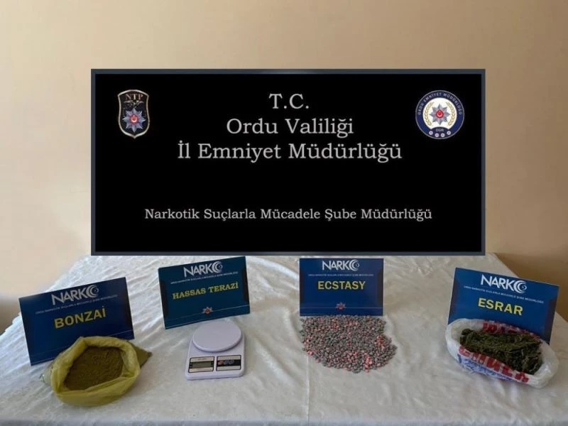 Genişletilen soruşturma kapsamında bir adreste yapılan aramada bin 400 adet ecstasy hap, 1 kilo 100 gram bonzai, 80 gram esrar maddesi, 1 adet hassas terazi ele geçirildi.