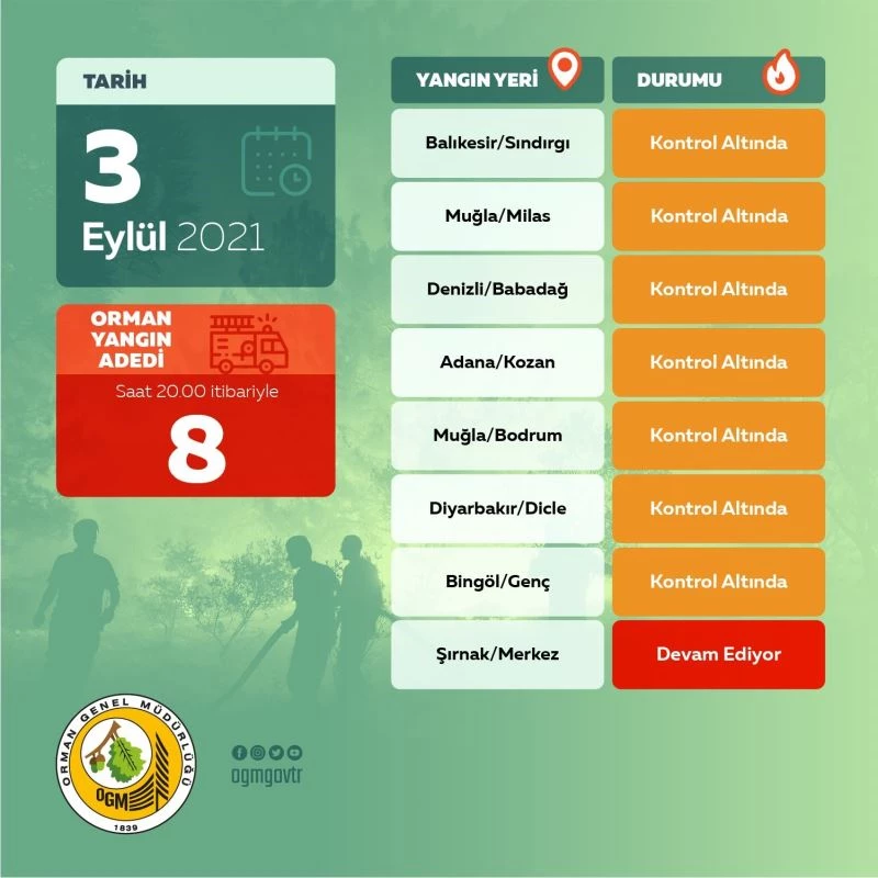 3 Eylül itibariyle Balıkesir, Muğla; Milas ve Bodrum, Denizli, Adana, Diyarbakır ve Bingöl’de meydana gelen orman yangınlarının kontrol altında olduğunun belirtildiği paylaşımda, Şırnak Merkez’de çıkan orman yangınının devam ettiği aktarıldı.