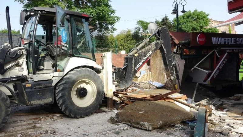 Kumpirciler Çarşısı olarak bilinen sokaktaki dükkanların yıkımına, içerisindeki malzeme ve araç gereçlerin boşaltılmasının ardından başlandı. Yıkım çalışmasının ilerleyen saatlerde sona ereceği öğrenildi.
