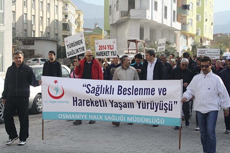 Osmaniye Sağlık Bakanlığı tarafından kronik hastalıklar ve obezitiyle mücadele kapsamında başlatılan `Türkiye Sağlıklı Beslenme ve Hareketli Hayat Programı` kapsamında  `Sağlıklı Beslenme ve Hareketli Yaşam Yürüyüş` etkinliği düzenlendi. Halk Sağlığı Müdürlüğü Olmayan Hastalıklar Programlar ve Kanser Şubesine bağlı Obezite, Diyabet ve Metabolik Hastalıklar Biriminin koordinasyonunda planlanan yürüyüş Devlet Bahçeli Bulvarı 1. Etap Güzergahında başlayıp; 4`üncü Etap bitişinden dönülmek üzere tekrar birinci etap da sonlandırıldı. Sağlıklı Beslenme ve Hareketli Yaşam Yürüyüş Etkinliğine; Çevre Şehircilik İl Müdürü Abdulvahap Güven, İl Defterdarı Niyazi Özkaya, İl Milli Eğitim Müdürü Ramazan Çelik, İl Sağlık Müdürü Dr. Mehmet Cingöz, İl Halk Sağlığı Müdürü Dr. Alper Latif Boz, Merkez İlçe Toplum Sağlığı Merkezi Başkanı Dr. Mehmet Çadırlı ve tüm sağlık çalışanlarının da katılımlarıyla toplamda 150 kişiyle gerçekleştirildi. Etkinlik bitiminde katılımcılara su dağıtımı yapıldı.