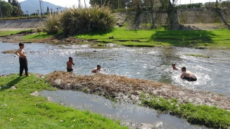 Kar suyuyla beslenen kanalda yüzerek keyifli anlar geçirdiklerini belirten çocuklar suyun soğuk olmadığını söylediler.