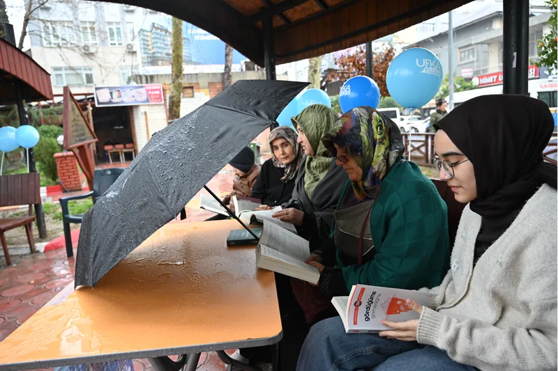 OSMANİYE - Osmaniye'nin Kadirli ilçesinde bir grup vatandaş, yağmurda şemsiye altında kitap okudu.
