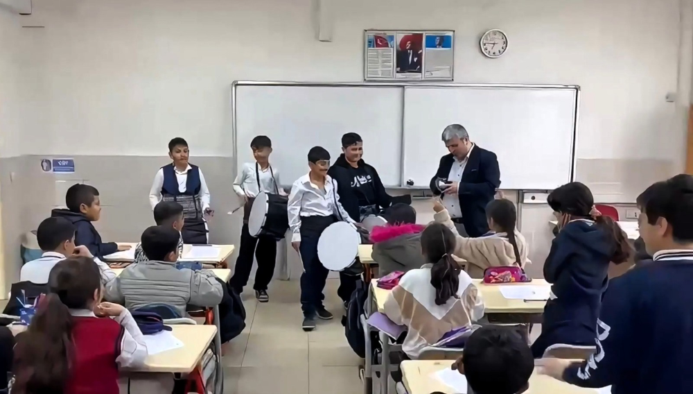 Ramazan davulcusu geleneğini canlandıran öğrenciler, söyledikleri “Davulun içi pekmez. Çalarım fakat ötmez. Bir bahşiş vermezseniz hocam, davulcu buradan gitmez.” şeklinde söyledikleri manilerle hem arkadaşlarına hem de öğretmenlerine keyifli anlar yaşattı. Sınıfları dolaşan “minik davulcular”, bir başka gelenek olan davulcu bahşişini de öğretmenlerinden aldı.