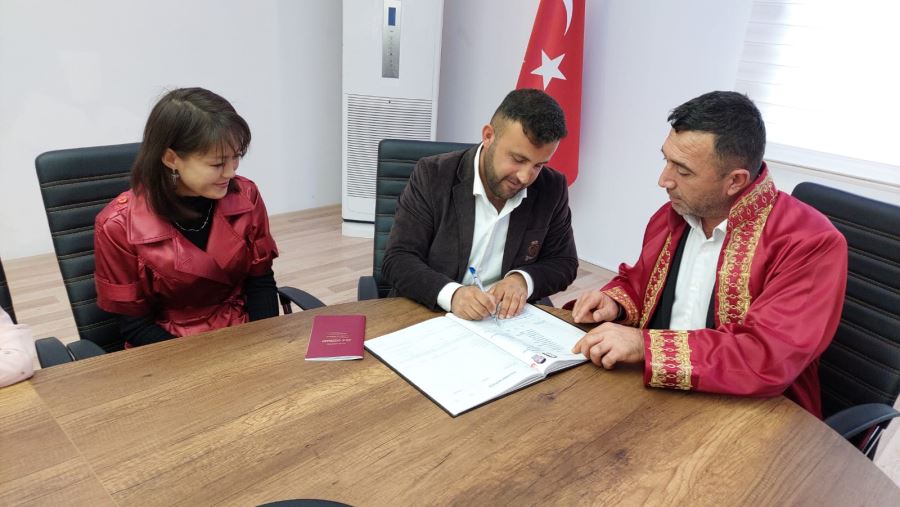 SERKAN TALAN- Kazakistanlı Yerkezhan Kabdrashit ve Recep Çağrı Toklu Osmaniye’nin Toprakkale ilçesinde düzenlenen nikah töreniyle dünya evine girdi. Toprakkale Belediyesi’nde düzenlenen nikah töreninde çiftlerin nikah şahitliğini Dağıstan mahalle Muhtarı İsmail Demir yaptı. Dünya evine giren genç çiftlerin mutluluğu ise gözlerinden okunuyordu. Kazakistan’dan Osmaniyeye’ye uzanan evlilik yolculuğu çiftlerin aynı iş yerinden birbirini tanımasıyla başladı. Birlerini seven çiftler daha sonra ise evlenme kararı aldı. Kazakistan’dan evraklarını Türkiye’ye getiren Yerkezhan Kabdrashit hayatını ülkesinden 3 Bin 100 km uzaklıktaki Osmaniyeli Recep Çağrı Toklu ile Toprakkale Belediyesi’ne düzenlenen nikah töreniyle birleştirdi. Nikah töreninde genç çiftlerin nikah şahitliğini yapan Dağıstan mahallesi Muhtarı İsmail Demir “Böyle güzel bir mutluluğa şahitlik etmekten gerçekten çok mutluyum. Çiftlere mutluluklar diliyorum” dedi. 3 bin km uzaktan kardeş ülke Kazakistan’dan gelin getiren Recep Çağrı Toklu ise “Birbirimizi sevdik. Allah böyle nasip etmiş. Sevgi mesafe dinlemiyor. Kendisi zaten geleneklerimize çok yabancı birisi değil. Benzeyen çok yönlerimiz var. Anlaşmakta zorluk çekmiyoruz. Mutluluğumuzu paylaşan akrabalarıma ve dostlarıma çok teşekkür ederim” ifadelerini kullandı. Belediye nikah salonunda düzenlenen nikah töreni sonrası genç çiftler mutluluklarını sevenleri ile paylaştı. Daha sonra çiftler belediye önünde hatıra fotoğrafı çektirdi.