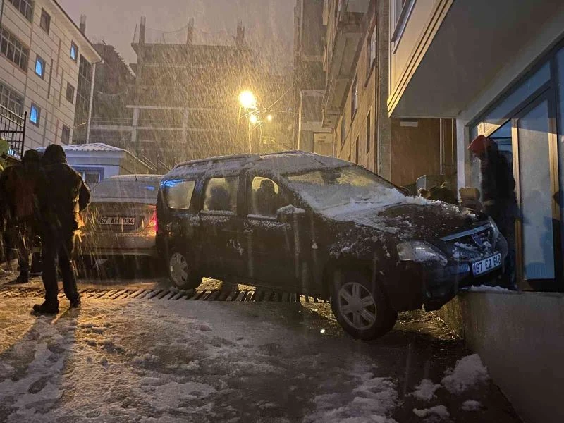 Zonguldak’ta iki otomobilin karıştığı kazada araçlardan biri apartmanın önüne düştü.
