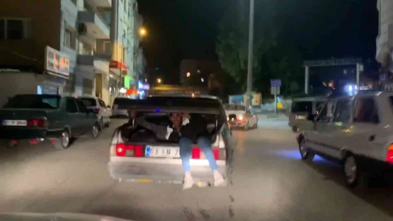 Edinilen bilgiye göre olay, gece saatlerinde Şanlıurfa’nın Birecik ilçesinde yaşandı. Seyir halindeki bir otomobilin bagajından sarkan ayaklar görenler büyük şaşkınlık yaşadı. Bir süre sonra bagajının kapağı açılan otomobilde genç yaşta 2 kişinin olduğu gözlendi. Trafikte ilerleyen ve içerisi de tıka basa dolu olan otomobilin bagajında tehlikeye aldırış etmeden yolculuk eden gençler kendilerini cep telefonuyla görüntüleyen sürücüye “Helal olsun dayı oğlu” diye seslendi. Bir süre kent merkezinde ilerleyen otomobil daha sonra Şanlıurfa karayoluna girerek yoluna devam etti.