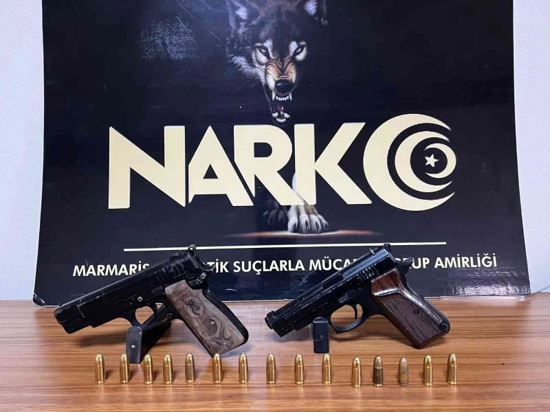Marmaris ilçe Emniyet Müdürlüğü Narkotik Suçlarla Mücadele Grup Amirliği ekipleri uyuşturucu madde kullanma ve ticaretini önlemeye yönelik yaptığı çalışmalarını aralıksız sürdürüyor. Denetimler çerçevesinde ekipler tarafından şüphe üzerine bir otomobil durduruldu. Ekipler tarafından otomobilde yapılan aramalarda, orta konsola zulalanmış 2 adet ruhsatsız tabanca, 27 adet farklı çaplarda fişek ile suçta kullanıldığı değerlendirilen 4 bin dolar, 3 bin euro ve 1 telefon ele geçirildi. Otomobilde bulunan R.B. ve A.A. isimli iki şüpheli gözaltına alınarak emniyete götürüldü.
