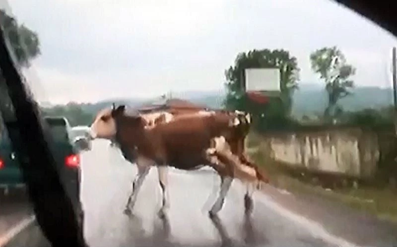 Yaşanan kaza anı ise otomobilin güvenlik kamerası tarafından saniye saniye kaydedildi. Görüntülerde otomobilin seyir halinde iken aniden önüne çıkan ineğe çarparak savurduğu görülüyor.