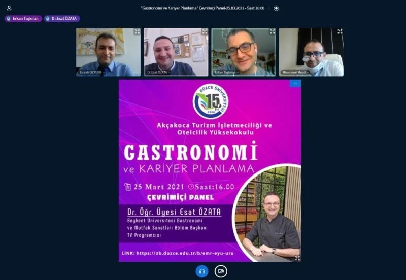Düzce Üniversitesi Akçakoca Turizm İşletmeciliği ve Otelcilik Yüksekokulu tarafından düzenlenen “Gastronomi ve Kariyer Planlama” başlıklı panel çevrim içi olarak gerçekleştirildi. Beykent Üniversitesi Gastronomi ve Mutfak Sanatları Bölüm Başkanı ve TV Programcısı Dr. Öğretim Üyesi Esat Özata, “Gastronomi ve Kariyer Planlama” başlıklı konuşmasına eğitim ve mesleki kariyeri hakkında bilgiler vererek başladı. Bu alanı bilinçli olarak seçtiğini, işini severek yaptığını ve çok erken yaşlardan itibaren bunun hayalini kurduğu belirten Özata, Almanya, Rusya gibi ülkelerde katıldığı yarışmalarda kazandığı ödüllere de değindi. Türk mutfağının uluslararası arenada temsili yapılırken dikkat edilmesi gereken bazı hususlar olduğunu söyleyen Özata, Türk mutfağının lezzet üstünlüğüne sahip olduğunu, sunum ve tabaklama konusuna ise dikkat edilmesi gerektiğini vurguladı.