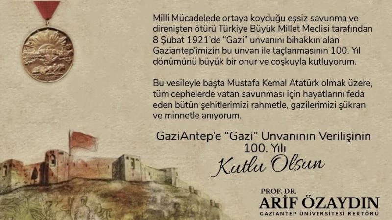 Gaziantep Üniversitesi Rektörü Prof. Dr. Arif Özaydın, Gaziantep’e ‘Gazilik’ unvanı verilişinin 100’üncü yıl dönümü nedeni ile bir mesaj yayımladı.