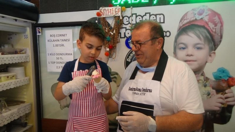 Dedeleri Makedonya’nın Uhriç kentinden göçerek 1950’li yıllardan itibaren Türkiye’de dondurmacılık mesleğini devam ettiren ve şimdilerde ise Bandırma’da ailenin üçüncü kuşağı olarak mesleğine devam eden Dondurmacı Yılmaz Atik, iyi dondurmanın sırrını İhlas Haber Ajansı’na anlattı. Atik, ailenin dördüncü kuşağı olan ve mesleğin varisi 8 yaşındaki torunu Mehmet Efe Çoban ile birlikte kameraların karşısına geçerek, iyi dondurmanın tarifini yaptı.