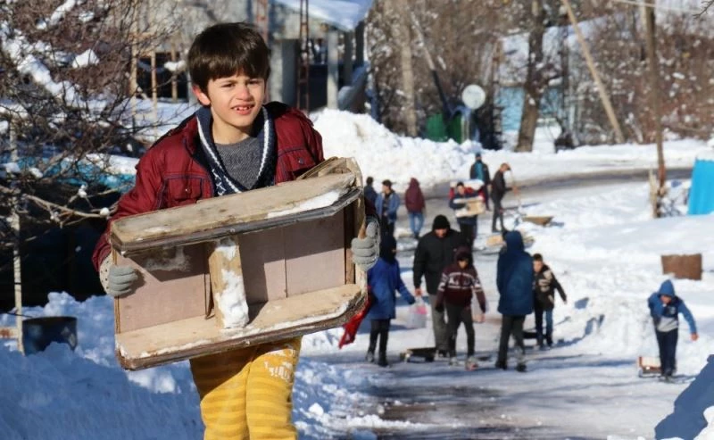 Van’ın Gevaş ilçesinde güneşli havayı fırsat bilen çocuklar, kendi imkanlarıyla yaptıkları kızaklarla kayarak karın keyfini çıkardı.