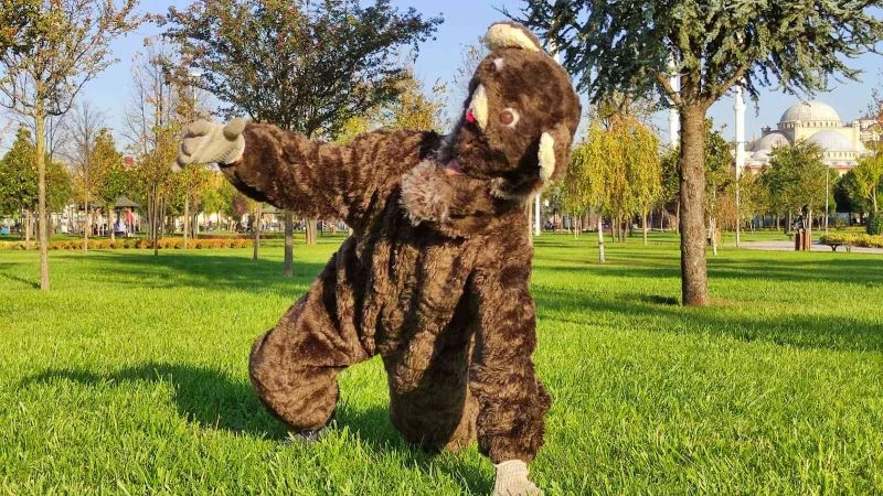 (Özel) Ayı kostümüyle parka girdi, vatandaşlara zehirli mantar uyarısı yaptı