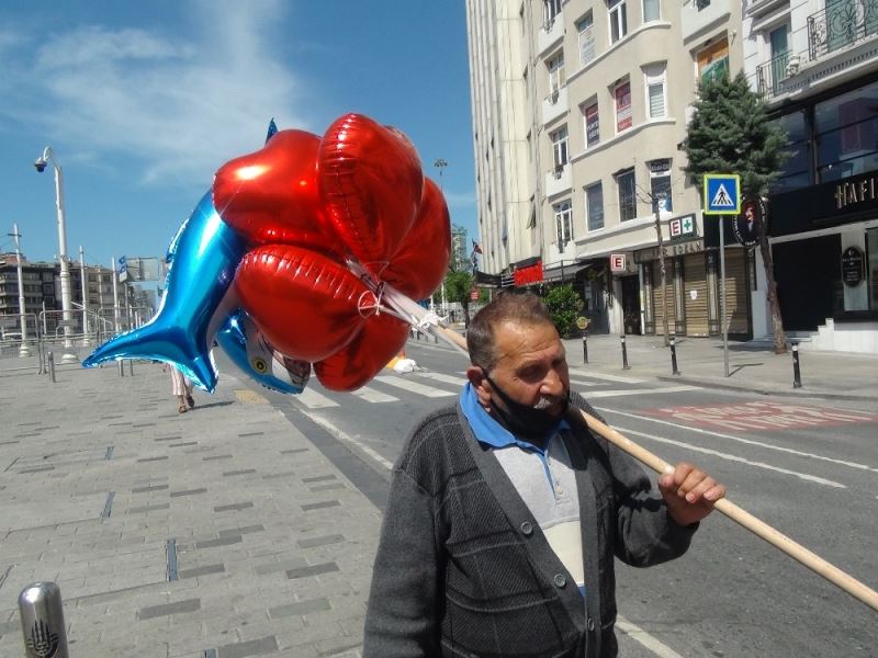 Yeni tip Korona virüsten (Kovid-19) korunma tedbirleri kapsamında sokağa çıkmaları kısıtlanan 65 yaş üzeri vatandaşlara yayınlanan son genelgeyle hafta sonu bir gün belirli saatlerde izini verilmeye başlandı. Bugün de saat 14.00 ile 20.00 saatleri arasında 65 yaş üzeri vatandaşların sokağa çıkmasına izin verildi. Seyyar satıcı olduğu öğrenilen 71 yaşındaki bir vatandaş da hem izin hakkını kullanmak hem de sokağa çıkan kendisi gibi 65 yaş üzeri yaşlılara balon satmak için Taksim Meydanı’na geldi.
