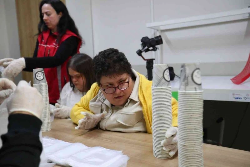 DENİZLİ – Özel bireylerin mesleki becerisi ve bütçelerine katkı sağlaması için kurulan Engelsiz Yaşam Akademisinde, günde ortalama 20 bin adet kağıt bardak üretiliyor.