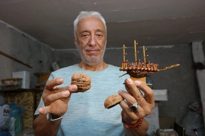Gemi karinasına benzeterek ilham aldığı ceviz kabuklarından minyatür gemiler yapan Eskişehirli Günay Karakılıç, yaptığı eserlerle ilgi çekiyor.