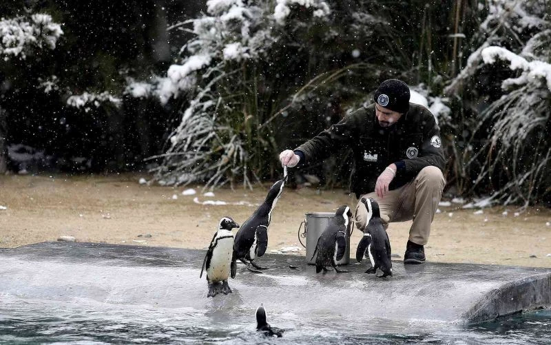 (Özel) Bursa’da kar altında penguenlerin beslenme saati