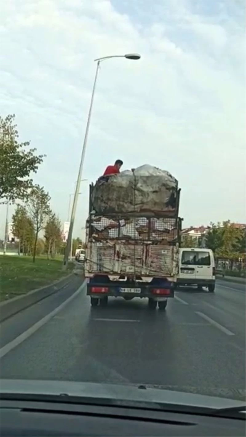 Arnavutköy’de hurda dolu kamyonetin kasasında seyahat eden 2 kişinin tehlikeli yolculuğu cep telefonu kamerasına yansıdı.
