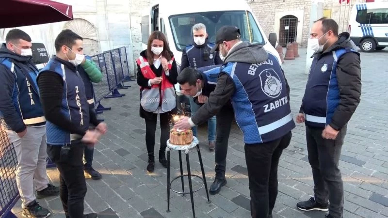 Beyoğlu Belediyesi Zabıta Müdürlüğü’nde görevli bir zabıta memuruna İstiklal Caddesi’nde görevi başında doğum günü sürprizi yapıldı. Doğum günü pastası ise aynı alanda görevli bir kadın polis memuru tarafından hazırlandı.