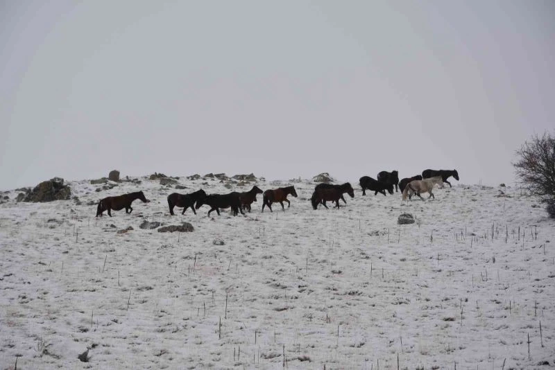 Kar altında yem arayan yılkı atlarını İHA görüntüledi