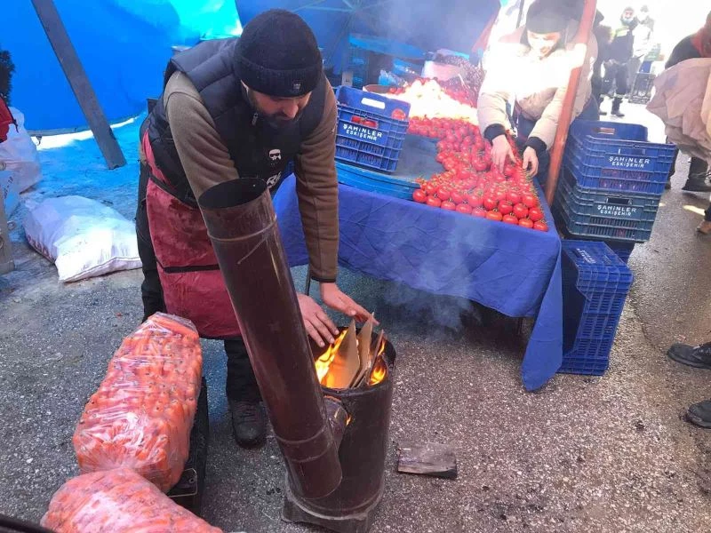 Pazar esnafı, Eskişehir’de son bir haftadır etkili olan soğuk havaya karşı hem mallarını korumak hem de kendilerini ısıtmak için tezgâhları başında soba kurdu.