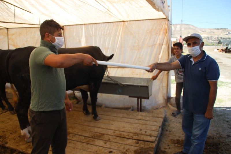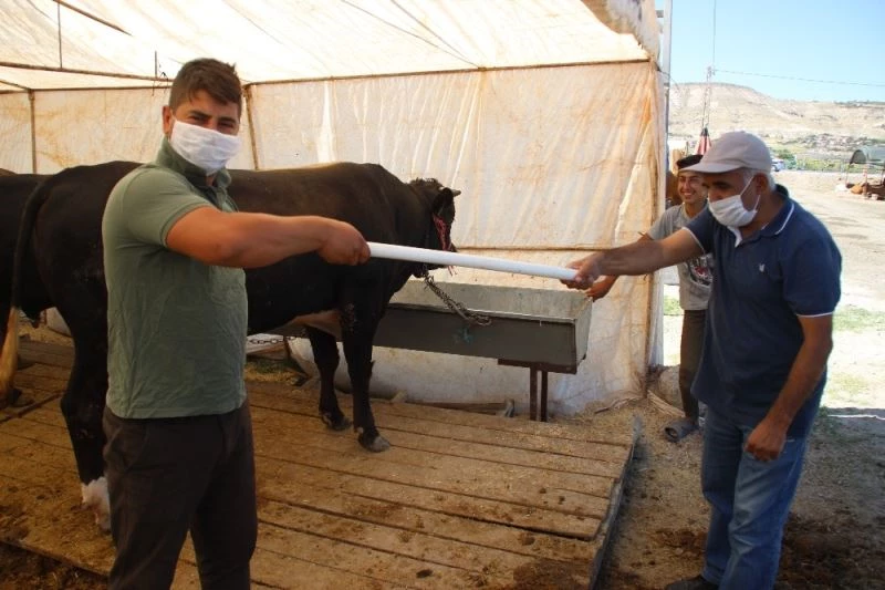 Kayseri’de hayvan pazarlarında besiciler tarafından korona virüs tedbirleri kapsamında sosyal mesafe kurallarına uymak amacıyla kullanılan boru ile çetin pazarlıklar yapılıyor.