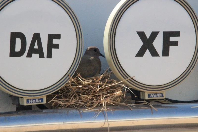 Şanlıurfa’da kuşun çekici kısmının üst tarafına yuva yaptığı tır, yavrular yumurtadan çıkıp uçana kadar sahibi tarafından seferden çekildi.