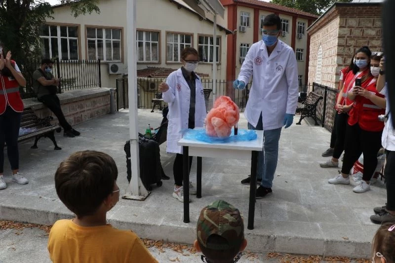 Edirne Medrese Ali Bey Mahallesi’nde bulunan tarihi Sarıcapaşa Camisi’nin bahçesinde düzenlenen programda, Gençlik ve Spor Bakanlığı tarafından destekli genç gönüllerin kurmuş olduğu kâr amacı gütmeyen Dutesa Platformu üyeleri tarafından minik öğrencilere, korona virüs pandemisi ve mücadele etme yöntemleri ile ilgili bilgiler verildi.