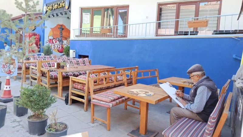 Eskişehir’de yaşayan 68 yaşındaki Ali Ünal, ilkokulda tebeşirle tahtaya resim çizerek başladığı sanatını 50 yıldır sürdürüyor ve eserlerini kafede sergiliyor.