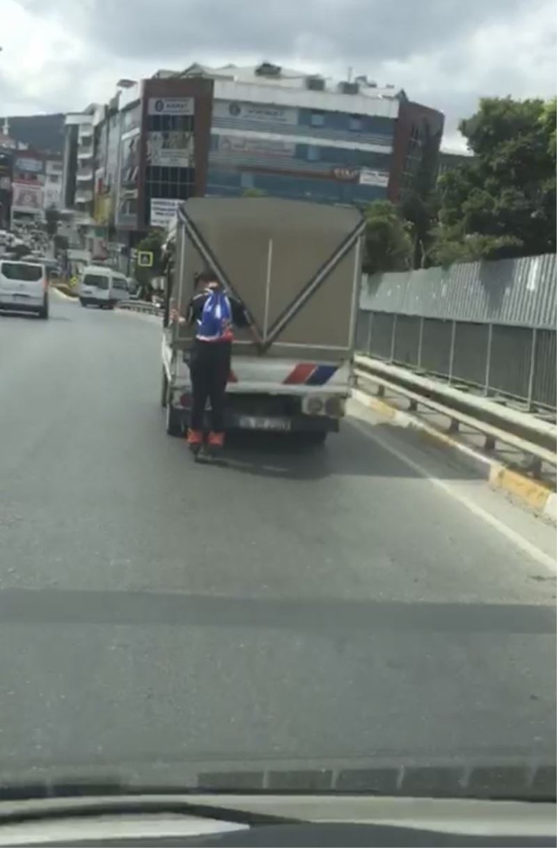 İstanbul’da patenli gençlerin tehlikeli yolculuğu vatandaşlar tarafından görüntülendi. Sultanbeyli’de ana yolda genç patenci, kamyonetin arkasından tutunarak kilometrelerce yolculuk yaptı. O anlar ise seyir halinde olan bir başka araçtaki vatandaş tarafından görüntülendi. Gencin kamyonetin arkasına takılarak seyir etmesi yürekleri ağza getirdi.