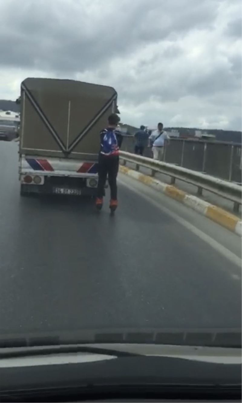 İstanbul’da patenli gencin tehlikeli yolculuğu cep telefonu kameralarına yansıdı. Ana yolda otobüsün arkasına takılan patenci, yürekleri ağza getirdi.