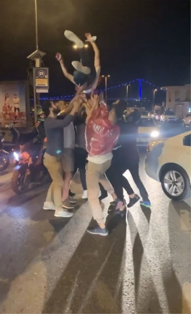 Eğlencelerin ardından araçlarına binen grup konvoy halinde trafiğe çıktı. Bir süre sonra yolu trafiğe kapatan gruptaki gençler, araçlarından inerek yol ortasında askere gidecek arkadaşlarını havaya fırlattı. Yollarda dörtlü sinyalleri yakarak şeritlere dağılan grup, trafiği yavaşlatarak hem kendi hem de vatandaşların canlarını tehlikeye attı. Magandalar patinaj çekerek ortalığı dumana boğup adeta mega kentin adeta altını üstüne getirdi.