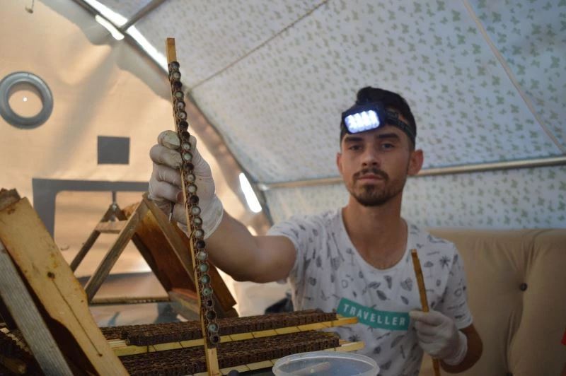 Hüseyin Diner, arı sütünün üretim safhalarını anlattı. Süt elde etmenin sıcak havalarda daha elverişli olduğunu aktaran Diner, bir günlük çalışma sonucunda 250-300 gram arı sütü elde ettiklerini belirtti. Üç çocuğu ile birlikte çalışan Hüseyin Diner, "Arı sütü belirli aşmalardan geçerek elde ediliyor. Öncelikle kovanların belli bir düzen de olması gerekiyor. Anasız kovanlarla çalışıyoruz. Başlatıcı ismini verdiğimiz bu kovanları öncelikle burada yaptığımız gibi larva transferi yöntemi ile özel süt çubuklarına larvaları ekiyoruz. 3 gün sonra verdiğimiz kovanlardan alıyoruz. Bu kovanlar kendilerine ana yapmak içgüdüsüyle anasız kovanlarda yapılıyor. Kendilerine larva yapmak için buraya süt basıyorlar. İş arılara verdikleri 5-6 katını veriyorlar. Biz de bu içgüdüden yararlanarak çıkan sütü tahta çubuk vesilesiyle. Direkt soğuk zincire yani buzlu kaplara koyuyoruz ve hasat bitmiş oluyor. Sabah saat 8’de geliyoruz, öğlen 14.00-15.00’a kadar devam ettiğimiz bir süreç bu. Burada arı sütü üzerine çalışan 10 kadar kovanımız var. 30 kilograma kadar bir verim bekliyoruz. Geçen sene buna yakın bir rakam elde etmiştik. Günlük 250 ile 300 gram arasında bir üretimimiz var. Bu da 3-4 günde 1 kilogram elde ediliyor" diye konuşarak bilgi verdi.