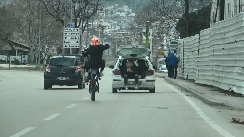 Motosikletin önünü kaldırarak tek teker üzerinde araçların arasında ilerleyen genci görenler hayrete düştü. Önünden giden bagaja oturmuş olan arkadaşına poz veren genç, hem kendi canını, hem de diğer sürücülerin canını tehlikeye attı. Sosyal medyada paylaşılmak üzere çekilen görüntüler bu kadarına da pes dedirtti. Polis ekipleri otomobil ve motosiklet sürücüsünü bulmak için çalışma başlattı.