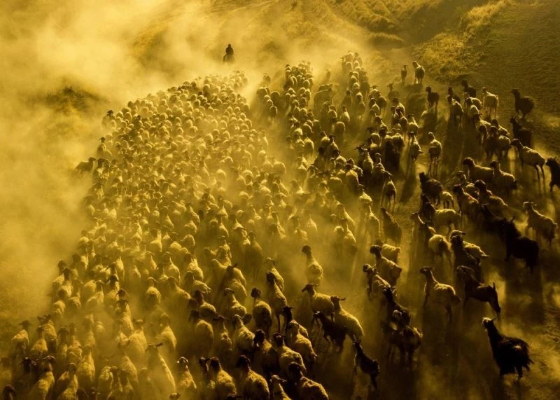 Koyun sürülerinin tozlu yol ve vadilerden geçişiyle beraber ortaya çıkan görüntüler havadan drone ile görüntülendi.