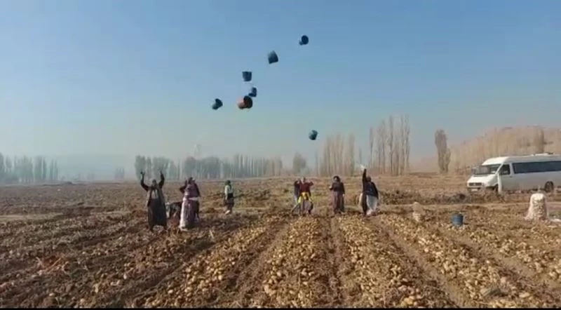 Afyonkarahisar’ın Şuhut ilçesinde kışlık patates hasadı yapan mevsimlik işçiler hasat sezonunu bitirdi. Çalışmaların sona ermesi ile birlikte patates topladıkları kovaları havaya atarak sezonu bitirmesi eğlenceli anlara sahne aldı.