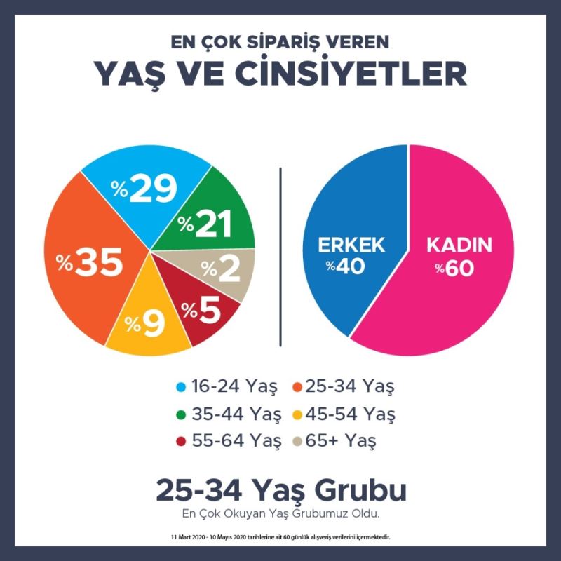 BKM KİTAP’ın pandemi döneminde alışveriş yapan kitapseverler üzerinden oluşturduğu istatistikler internetten kitap siparişi verenlerin büyük çoğunluğunun (yüzde 35) 25-34 yaş aralığında toplandığını gösteriyor. Ayrıca sipariş veren kitapseverlerin yüzde 60’ının kadın olması artık kadınların kitap okuma alandaki liderliğini pekiştiren bir rakam oldu.