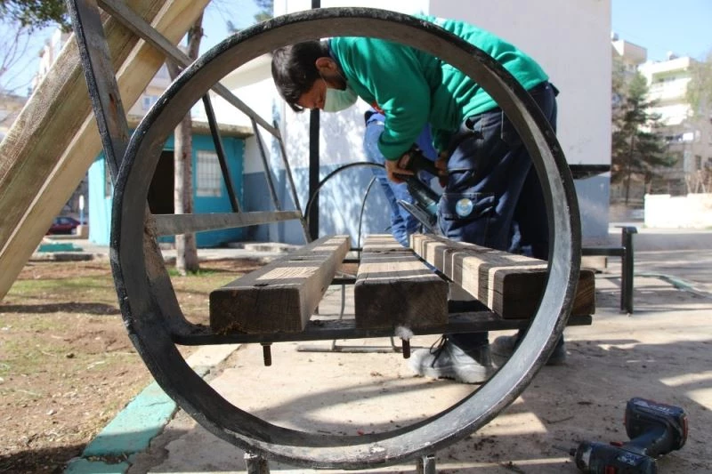 Şanlıurfa’da Haliliye İlçe Belediyesi, park ve bahçelerde deforme olan bank ve kamelyaları, geri dönüşüm atölyesinde ilk günkü görünümüne kavuşturuyor.