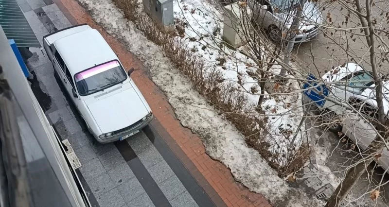 Kırşehir’de çift sıra parklanmanın olduğu alandan çıkamayan sürücü, çıkışı kaldırımı kullanarak yaptı.