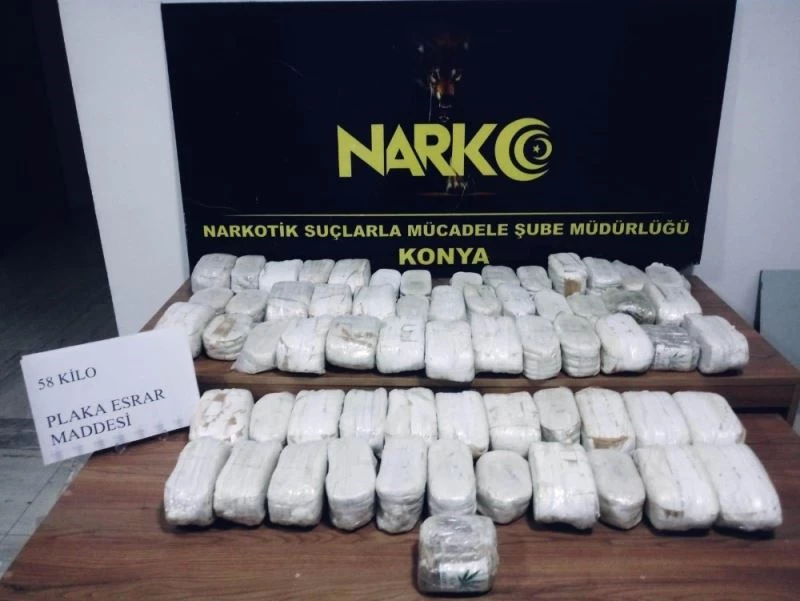 Öte yandan, Narkotik Suçlarla Mücadele Şube Müdürlüğü ekipleri, Aksaray Narkotik Suçlarla Mücadele Şube Müdürlüğü ekipleriyle yaptıkları müşterek analiz çalışmaları neticesinde, öncü-artçı iki araçla uyuşturucu sevkiyatı yapacağı bilgisi üzerine çalışma başlattı. Yapılan takip sonrasında öncü araç Ereğli Yolu Uygulama noktasında durdurulurken, artçı olarak tabir edilen ikinci araç ise ‘dur’ ihtarına uymayarak kaçtı. Polisle yaşanan kovalama sonunda kaçan otomobil yaralamalı kazaya karıştı. Yaya olarak kaçmaya başlayan 3 şüpheli şahıslar, polisler tarafından yakalandı. Kaza yapan araçta narkotik köpeğinin desteğiyle yapılan aramada, koltukların arka kısımlarına gizlenmiş 58 kilogram plaka esrar maddesi ele geçirildi. Gözaltına alınan 3 şüpheli, sorgulanmak üzere emniyete götürüldü.