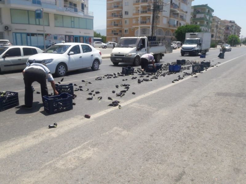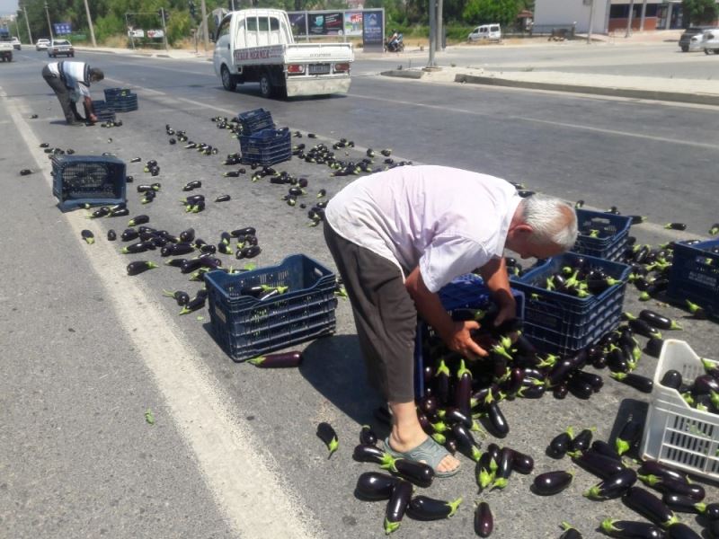 Antalya’da topladığı patlıcanları kamyonetiyle hale götürmek üzere yola çıkan üreticinin ürünü yola dökülünce imdadına aracını durdurup yardıma koşan vatandaşlar yetişti.
