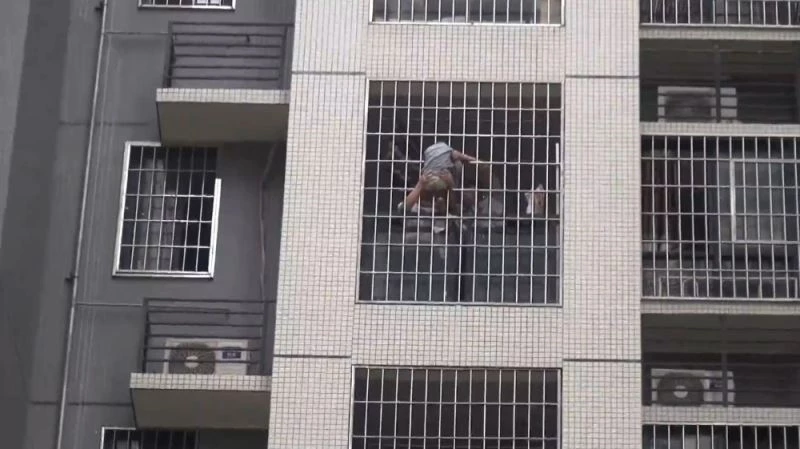 Çin’de bir apartmanın 7. katında pencere korkuluklarına sıkışan çocuk, itfaiye ekipleri tarafından kurtarıldı.