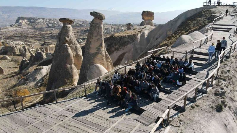 Nevşehir Hacıbektaş Veli Üniversitesi Fen Edebiyat Fakültesi Coğrafya Bölümü 1. Sınıf öğrencileri, Kapadokya’ta peribacalarının arasında ’Ders Coğrafya, Konu Kapadokya’ temalı alan etkinliğine katıldı.