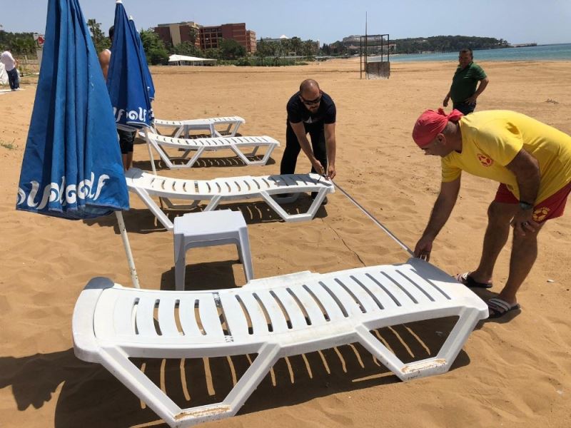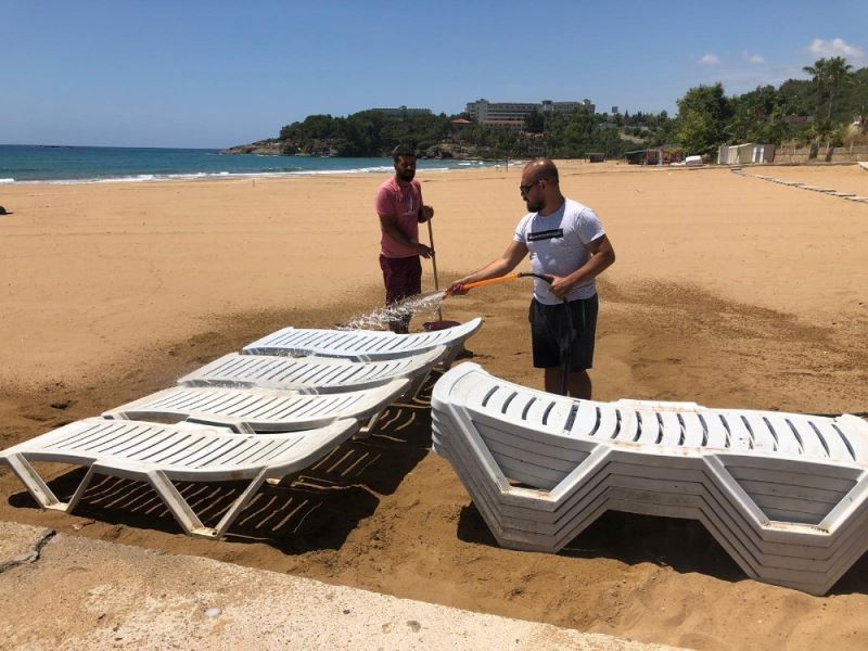 2019 yılının Kasım ayında kapanan Alanya İncekum Plajı’nda geçtiğimiz hafta başlayan çalışmalar, bu hafta da devam etti. İlk olarak sosyal mesafe kapsamında şezlong aralığını 2 metre olarak ölçen işletmeciler, masa, sandalye ve şezlong sayıları da yarıya düşürdü. Aynı zamanda plajda temizlik çalışmaları da aralıksız sürdürülüyor. Masaları, sandalyeleri, şezlongları, büfenin camlarını ve yerleri dezenfektan kullanarak temizleyen işletmeciler, ilaçlama çalışmalarını da yapıyor.