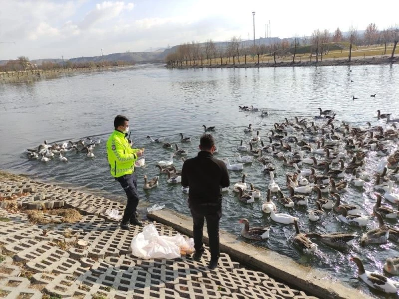 Nevşehir’in Avanos ilçesinden geçmekte olan Kızılırmak nehrinde bulunan kaz ve ördekleri Avanos İlçe Emniyet Müdürlüğünde görevli polis memurları besledi.