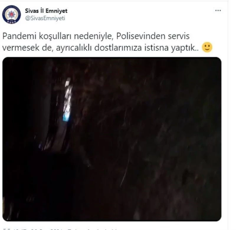 Sivas İl Emniyet Müdürlüğü paylaşımda, “Pandemi koşulları nedeniyle, Polisevinden servis vermesek de, ayrıcalıklı dostlarımıza istisna yaptık” ifadelerine yer verdi.