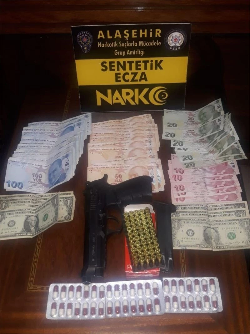 Alaşehir İlçe Emniyet Müdürlüğü’ne bağlı polis ekipleri bu sabaha karşı 02.00 sıralarında Soğuksu Mahallesi’nde seyir halinde bulunan bir araç içerisinde bulunan D.C. (22) isimli şahsın üzerinden 6 adet uyuşturucu hap ele geçirildi. D.C. isimli şahsın, ele geçirilen hapları H.D. (35) isimli şahıstan 100 TL karşılığında satın aldığını beyan etmesi üzerine, H.D. isimli şahsın evinde ve motosikletinde yapılan aramada, 42 adet uyuşturucu hap, 1 adet kurusıkı tabanca ve 50 adet mermi, uyuşturucudan elde ettiği değerlendirilen 4 bin 300 TL para ve 6 ABD Doları ele geçirildi. Şüpheli H.D. isimli şahıs uyuşturucu ticaretinden, D.C. isimli şahıs ise içicilikten gözaltına alındı. Gözaltına alınan iki şahsın da emniyetteki sorgularının devam ettiği öğrenildi.