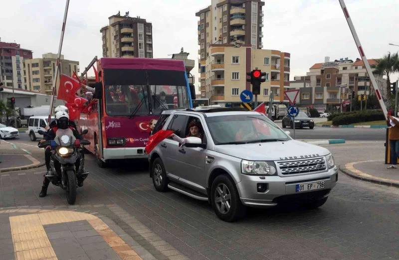 Çocuklar, polis araçları, klasik otomobil ve büyükşehir belediyesine ait üstü açık otobüsle oluşturulan kortejle şehir turu attı. Kortejle Sarıçam Belediyesi hizmet binası bahçesinde gelen çocuklar gösteri sundu. Engelli bir çocuğun Zeybek oynaması dikkat çekti. Türk bayrağı kıyafetli bir engelli çocuğun asker selamı verdiği görülürken çocuklar Atatürk posterli Türk bayrakları açtı.
