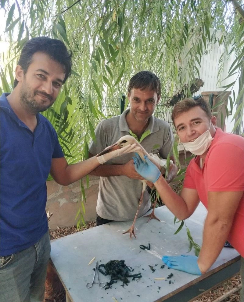 Alınan bilgiye göre, Hatay Su ve Kanalizasyon İdaresi Genel Müdürlüğü çalışanı Hasan Aslan iş yerine giderken Kızlarçayı Mahallesi’nde yol kenarında ölmek üzere olan bir leylek gördü. Leyleği alan Aslan, tedavisi için Erzin İlçe Tarım ve Orman Müdürlüğü’ne götürdü. Veteriner hekimler tarafından muayene edilen leyleğin poşet yuttuğu anlaşıldı. Veteriner hekim tarafından poşet çıkarılarak leylek hayata döndürüldü.